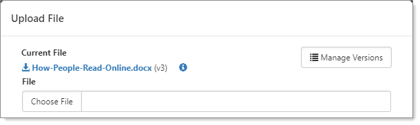 When a new file is uploaded using the default version setting, the Current File moves to the versions list, and sets the newly uploaded file as the primary.