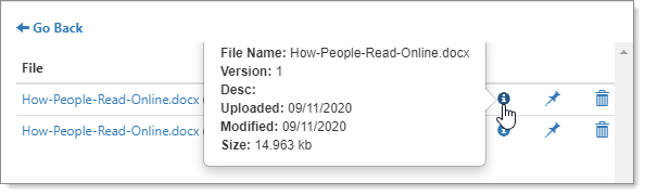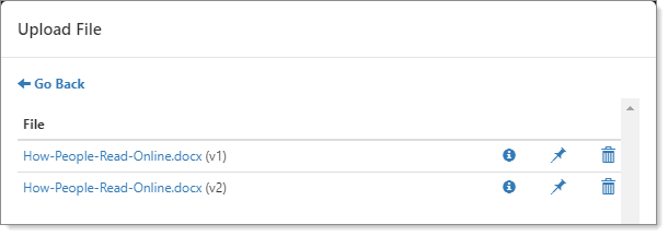 On Attachment lists or Dataform Fields, only the primary file is displayed. Using Upload File, you can manage versions. There is no technical limit to the number of files that can be included in the hierarchy, but only one file is designated as the primary file at any time. You can also browse the list of uploaded versions, pin them as the new current version, open the file, and removed the file.