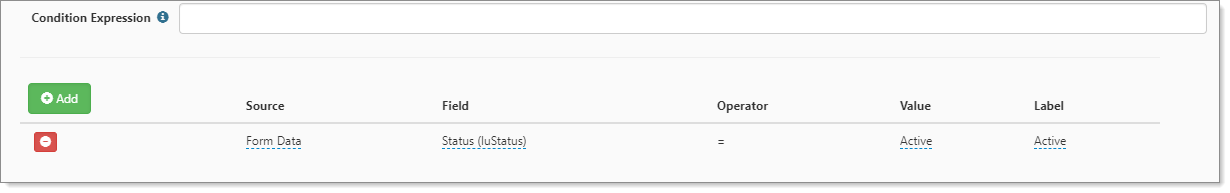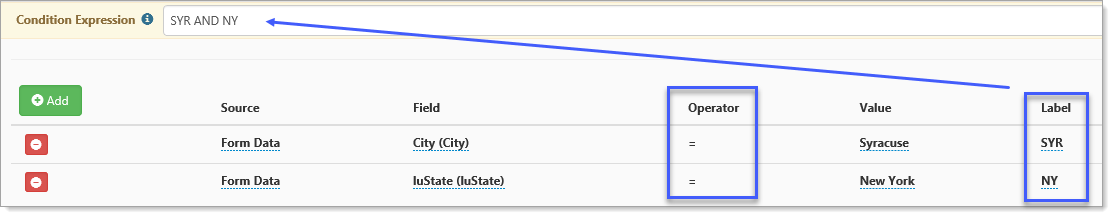 In the Add area of the form, you define conditions using Source, Field, Operator, and Value. You assign the condition a name using Label. Label values are used in the Condition Expression field located before the Add area.