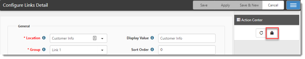 Note: When at least one role is associated with a custom link, the Security icon color in the Action Center changes from black
