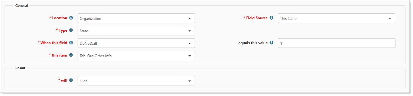 Note: This field displays in the Result fieldset when a user selects State in the Type field up in the General fieldset. Clear Field on Disable/Hide does precisely that. It removes any information previously stored in this field when it is hidden or disabled. This is a hard delete from the system, so exercise careful planning when choosing this option. Hiding a fieldset hides all fields within the fieldset, masking any required field actions for those fields.