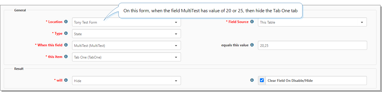 When the field named MultiTest has a value of 20 or 25, then the tab named Tab One is hidden.