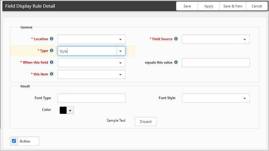 Note: This field displays in the Result fieldset when a user selects Style in the Type field up in the General fieldset. The Sample Text is a preview of how the Font Type, Font Style and Color settings will display when applied.