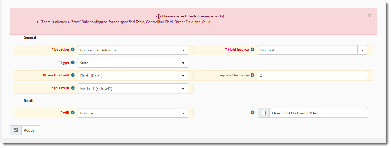 Validation for conflicts is in place to ensure that the target field does not already have a field display rule set up with a conflicting behavior. For instance, if a previous rule was set up to expand a fieldset and another rule that references the same Type, Field Source, controlling field (i.e., When this field), value (i.e., equals this value), and target field (i.e., this item) is set up to collapse the same fieldset on the same dataform, an error message similar to the following displays: