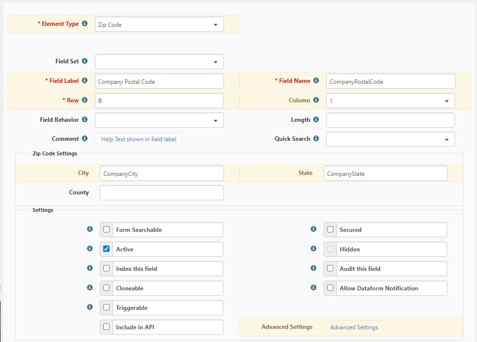 The Zip Code datatype is a dynamic control that can be configured to auto-fill related fields on the form. This can be a great time saver, especially when configuring dataforms with multiple address fields. The field is configured using a semi-colon separated list of related fields in the Advanced Settings properties of the dataform field.
