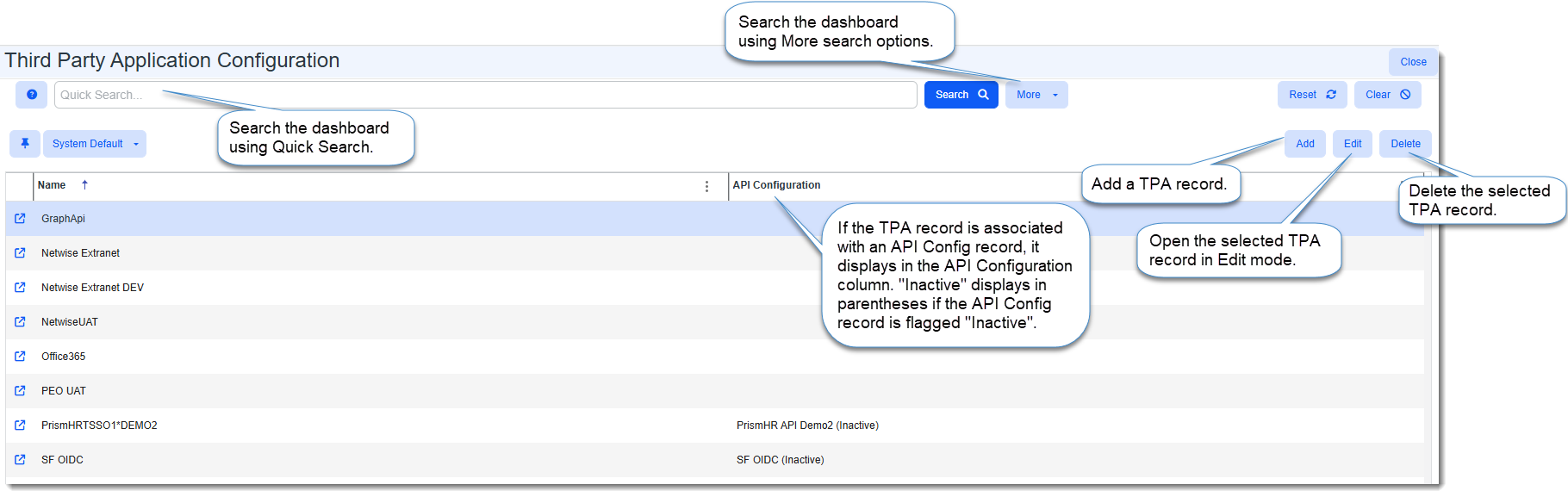 1. Select the TPA record in the Third Party Application Configuration Dashboard and click Delete.