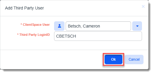 The Add Third Party User dialog box opens. This is where you add user records for each user who will connect from ClientSpace to the third-party application.