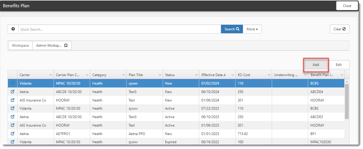Note: The Admin workspace can be accessed by searching for "Admin" in the Workspace Search dashboard. Once you are in the Admin Workspace, enter "Benefits Plan" in the search for dataform field and then click the Benefits Plan tile to view existing master plans or add a new plan. To view an existing plan, double-click the row or click