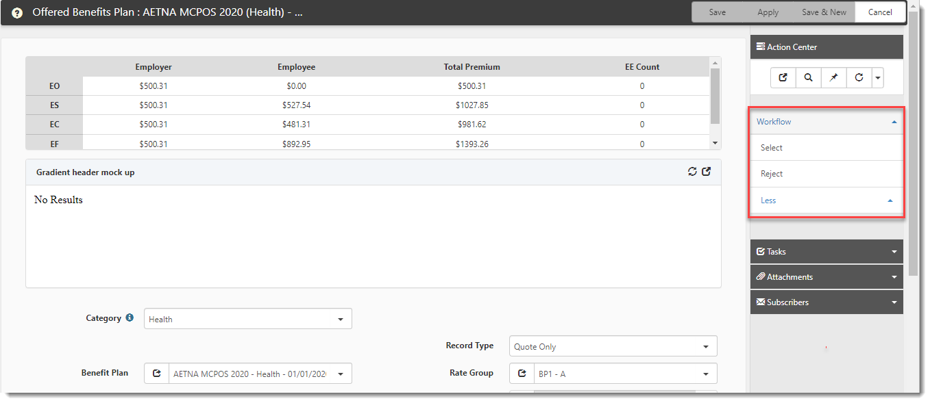 In the Action Center, under Workflow, click Select to select this plan for export to PrismHR or click Reject to exclude the plan from being exported.