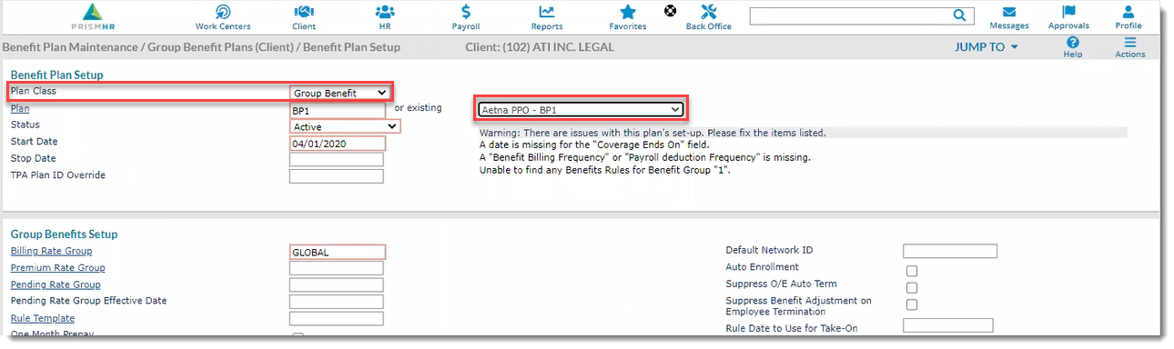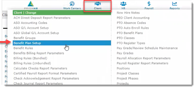- On the PrismHR Client menu, select Benefit Plan Setup.