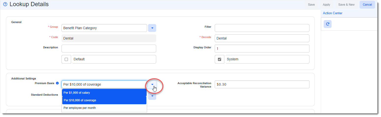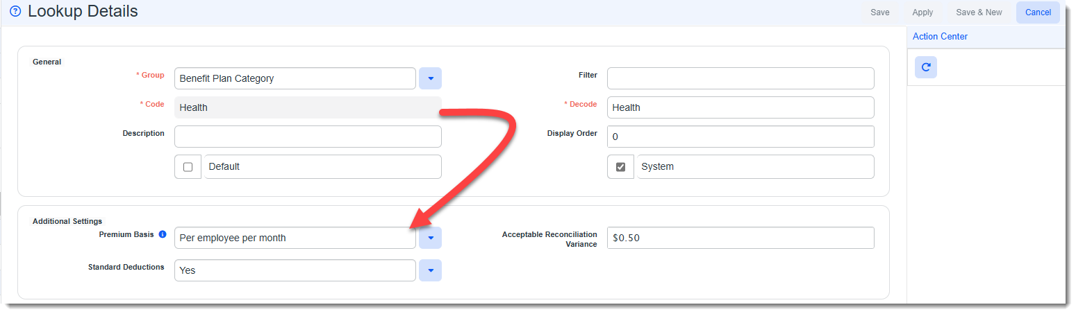 On the Benefit Plan Category lookup detail form, there is a Premium Basis drop-down field which is used to classify plans by premium basis. The following field values are available in the field: