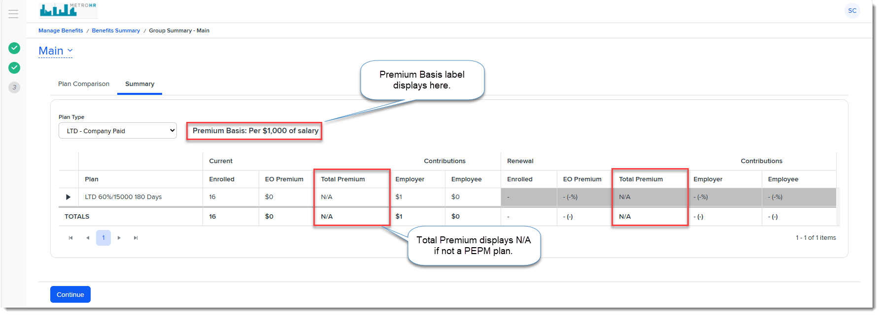 On the Group Summary > Summary tab, a new field label displays next to the Plan Type. Also, if the assigned Premium Basis is not PEPM, the Total Premium column displays "N/A".