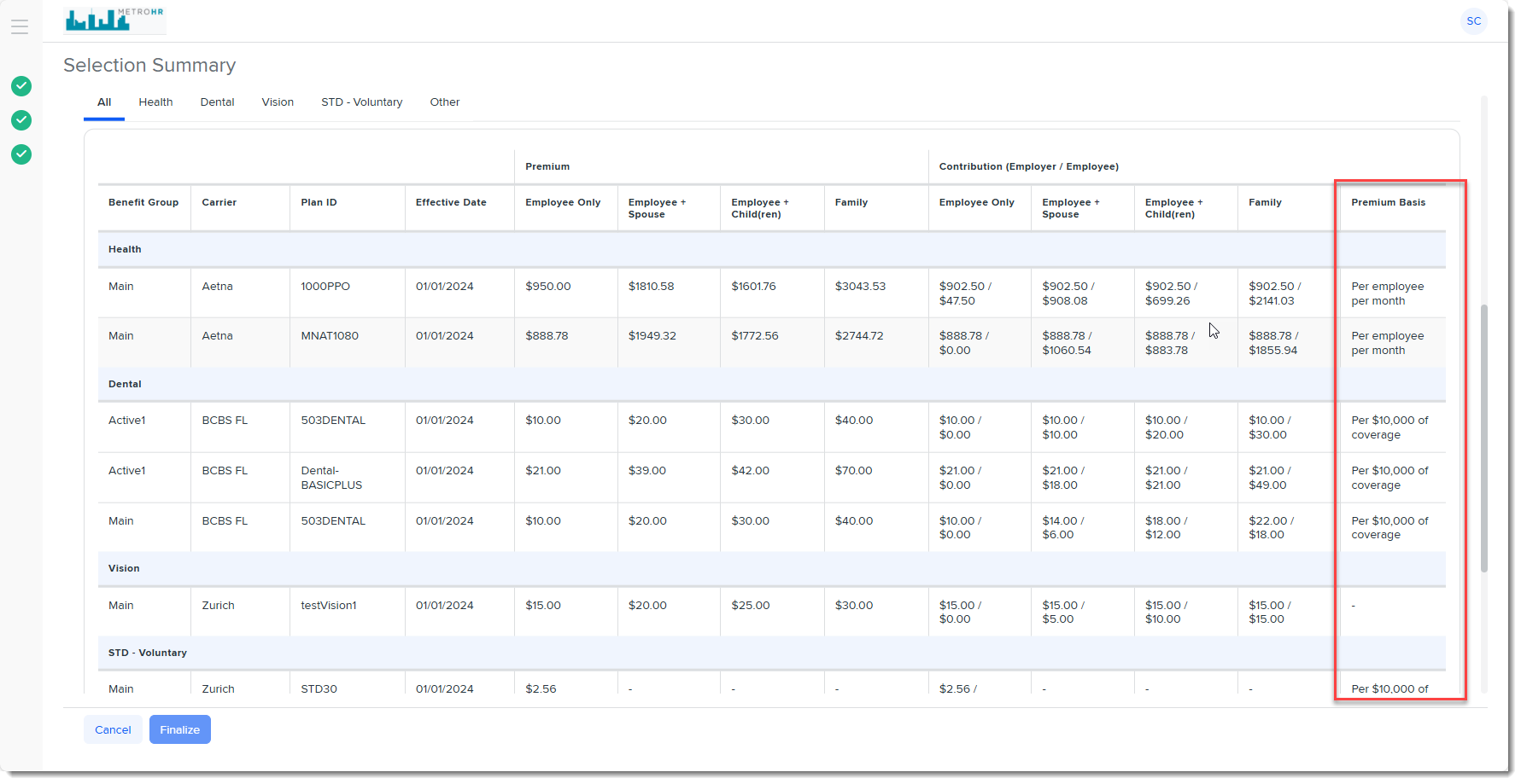 On the Selection Summary page, a Premium Basis column has been added which displays the Premium Basis assignments for each plan.