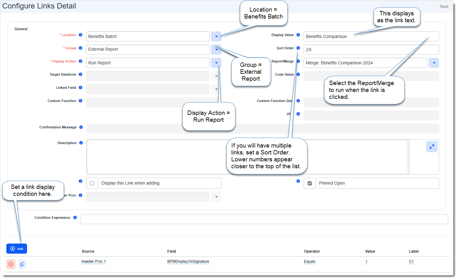 To display a link on the Selection Summary/Signature Page: Select Source = Header Proc1, Field = BMPDisplayonSignature, Operator = Equals and Value = 1.