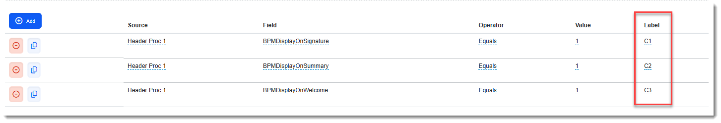 To display a link on the Summary Page: Select Source = Header Proc1, Field = BMPDisplayonSummary, Operator = Equals and Value = 1.
