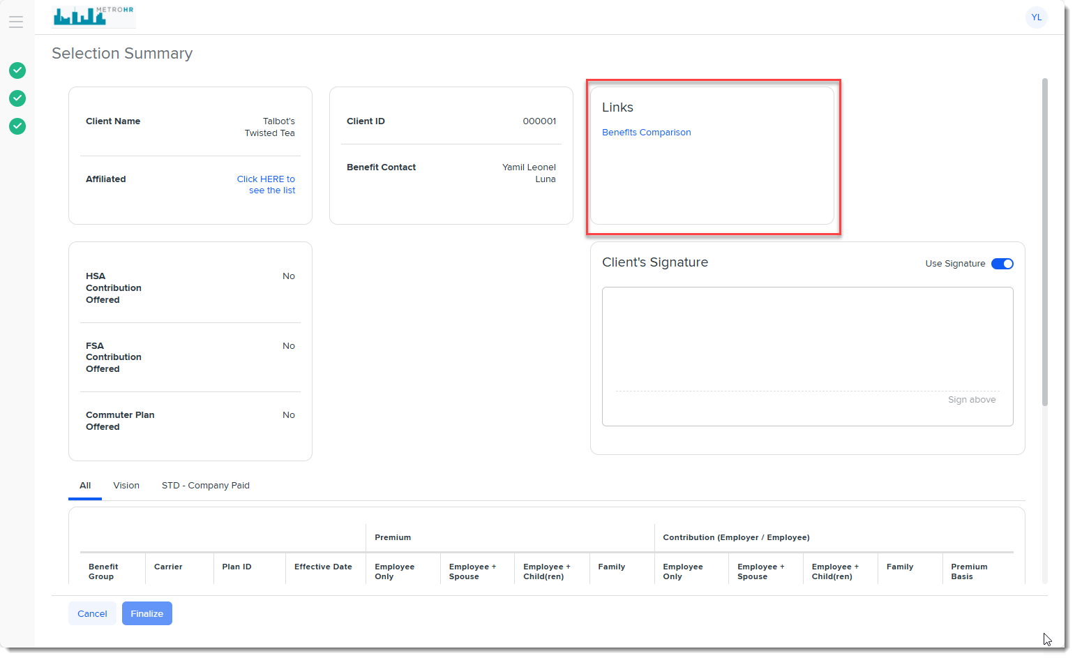 In the following example, a link to the Benefits Comparison merge is being added to the BPM Selection Summary/Signature page: