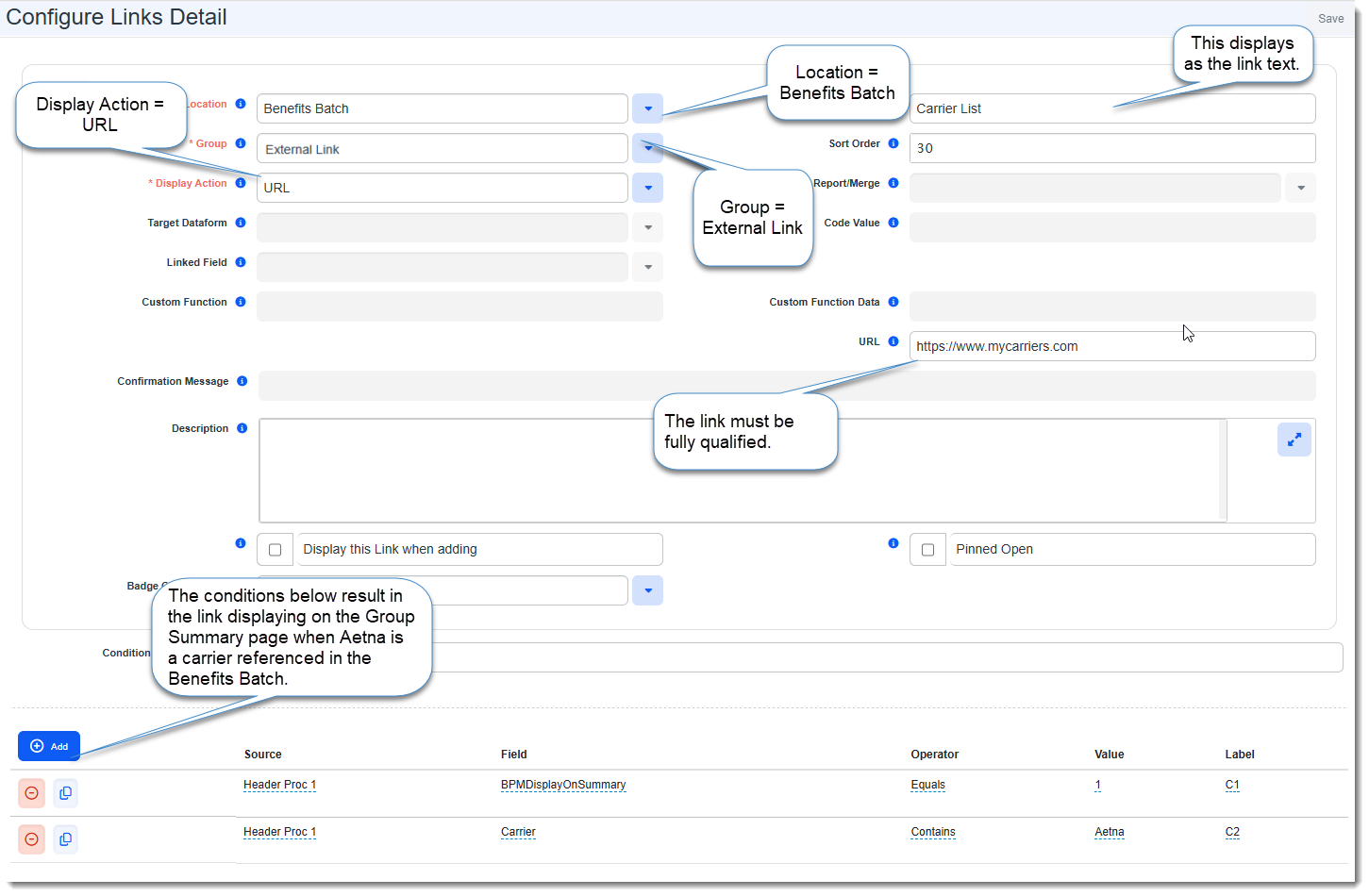 In the following example, we are setting up a fictitious URL link to a carrier website that only displays when the Carrier field in Header Proc 1 contains a value of "Aetna". This means that if there is a value containing "Aetna" in your Benefits Batch record Carrier table, then the link will display. Although our example is for one carrier, you could set up links for all carriers and the links would only display when relevant (i.e., when the Benefits Batch references that carrier).