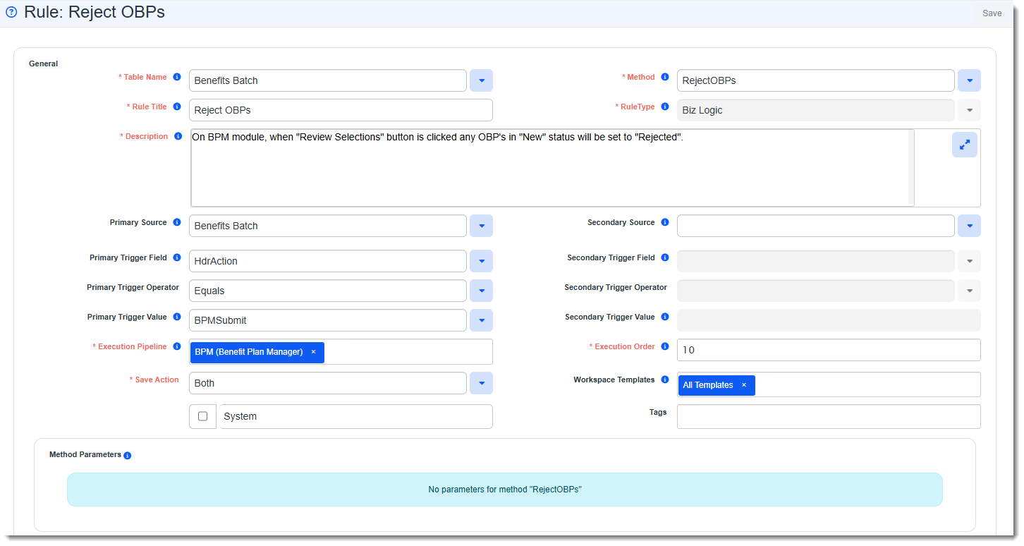 The example below of Reject OPBs business rule configuration shows how a Save operation business rule is set up for BPM. The Primary Trigger Field = HdrAction, the Primary Trigger Operator = Equals, the Primary Trigger Value = BPM Submit ,and the Execution Pipeline = BPM. For a different save operation, a different Primary Trigger Value would be selected: