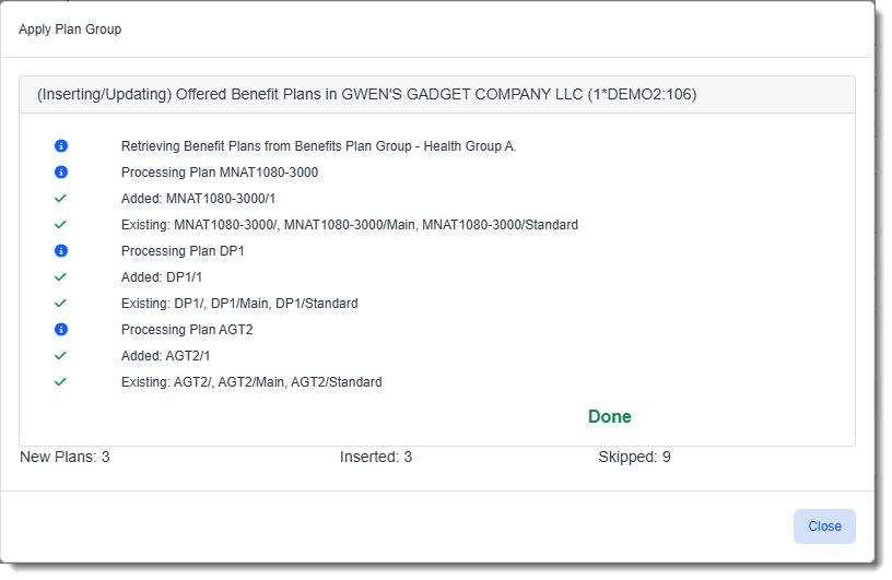 The Apply Plan Group progress window displays. This is a "real time" progress window displaying processing status messages. When processing completes, "Done" displays near the bottom of the window and summary totals for New Plans, Inserted and Skipped display.