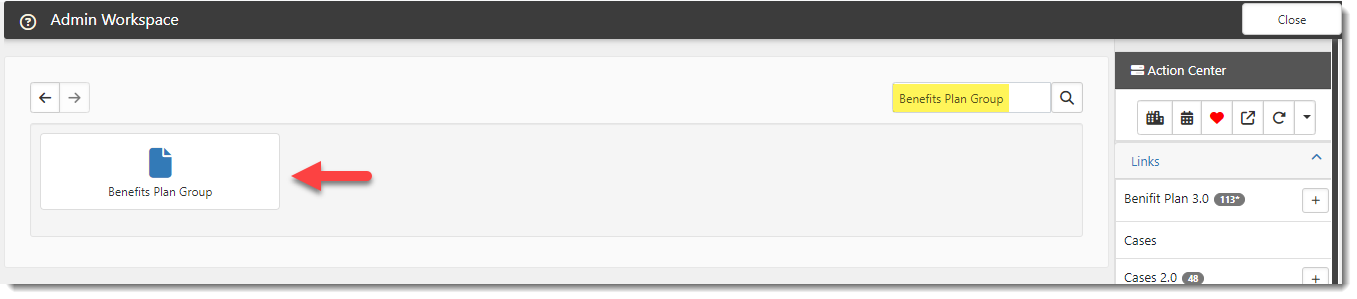Once in the Admin Workspace, type "Benefits Plan Group" in the dataform search box to display the Benefits Plan Group tile, and click the tile to open the Benefits Plan Group dashboard/search form.