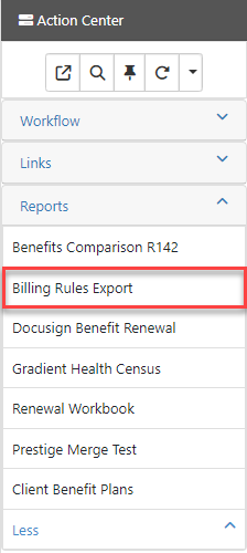 In the Action Center, under Reports, click the Billing Rules Export link.