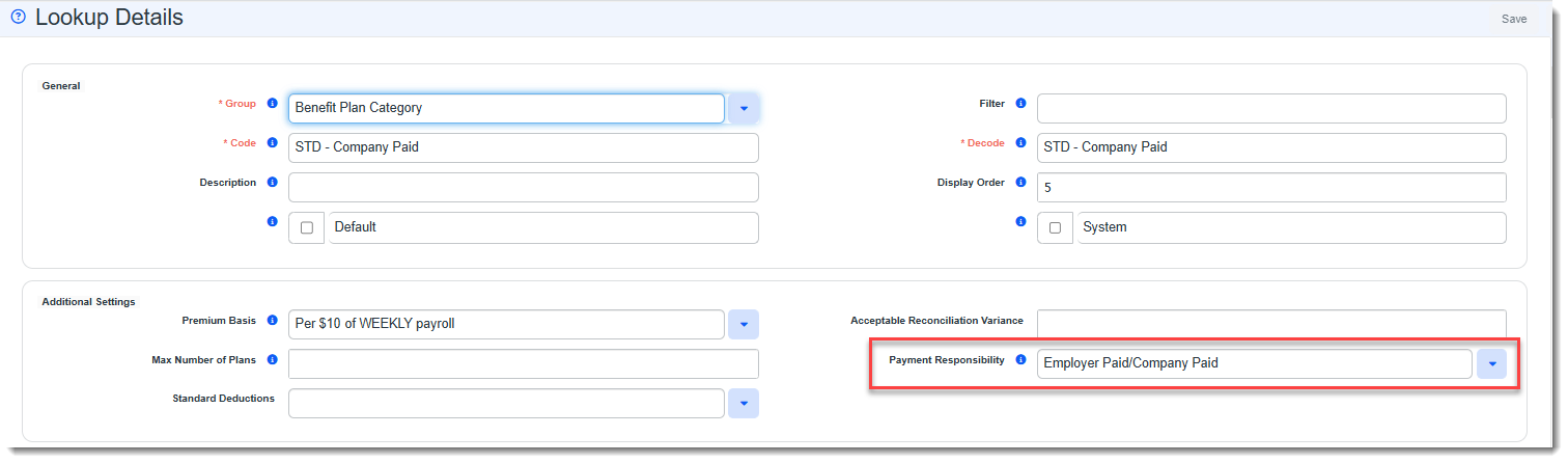 On the Benefit Plan Category lookup detail form, there is a Payment Responsibility drop-down field. This is a metadata field which works with the Default Company Paid And Voluntary Employer Contrib business rule on the Offered Benefits Plan table. The rule evaluates the Payment Responsibility field values and then updates the Contribution Method percentage and amount fields in the Employer Contributions (%) fieldset of the affected Offered Benefit Plans (OBPs) for all available coverage levels as appropriate.