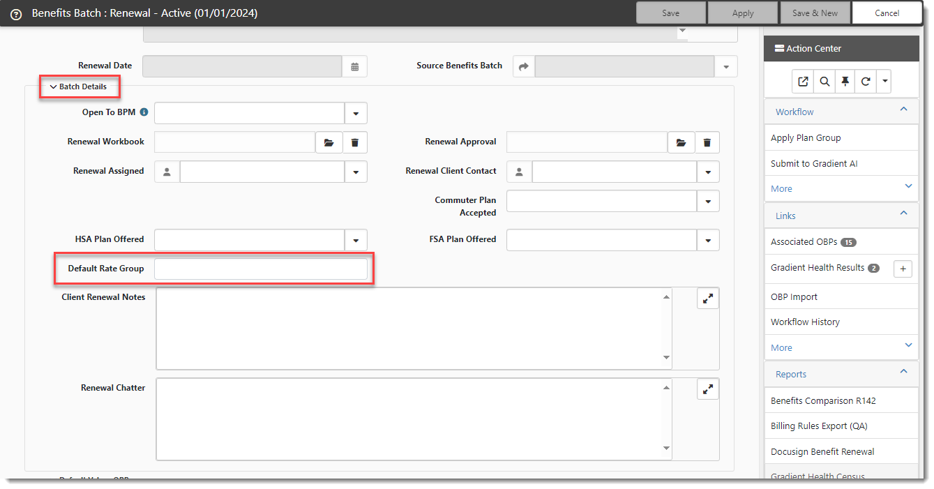 To set the Default Rate Group on the associated Benefits Batch: