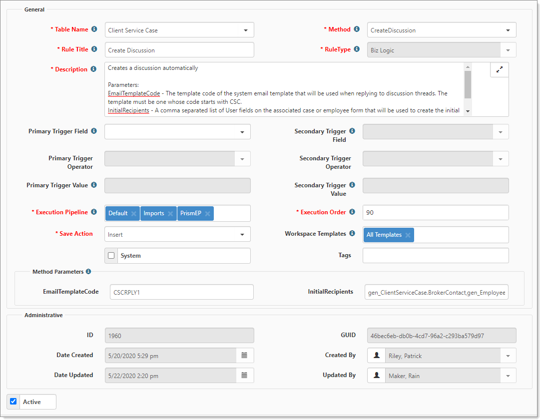 The Client Service Case rule Create Discussion, automatically creates a case discussion based on configured triggers. The rule is scripted as inactive and requires the following parameter configuration: EmailTemplateCode and InitialRecipients. After you configure and activate, the rule creates a new discussion and triggers an automated email to the initial recipients based on the rule parameters.