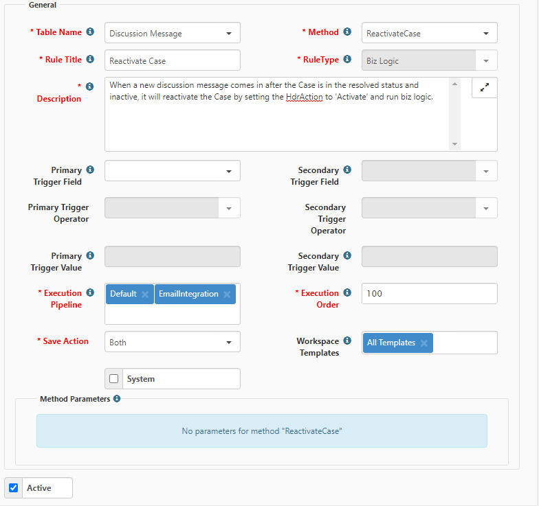 The Reactivate Case business rule runs on the Discussion Message dataform on the Default Pipeline. This rule triggers when the system receives a reply to a case discussion message after the case is in a resolved status and inactive. When triggered, the system reactivates the case by calling business logic and passing an HdrAction of Activate.