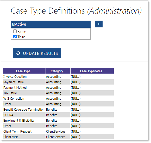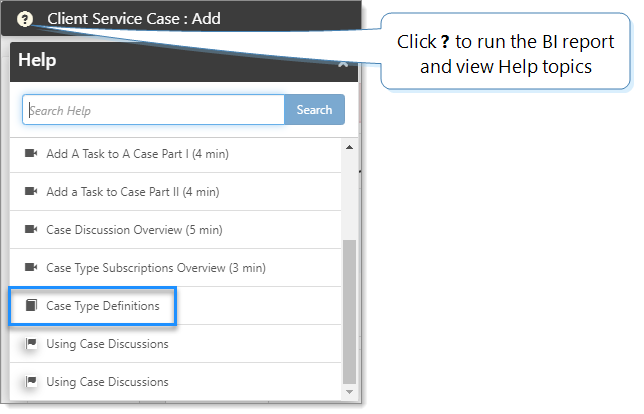 You can run a Business Intelligence (BI) report to list your organization's case types, categories, and any notes. You can run the report in BI or from the Client Service Case Details page, which can be accessed when adding or editing a Client Service Case.