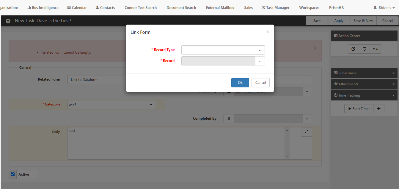 If not adding directly from a dataform, the default is Link to Dataform. Used to attach the task to a dataform if required by your current security role assignment. If you click Save or Apply without selecting a dataform and receive a "Related From cannot be empty" error, you are required to click in the Related Form field and select the Record Type and Record (i.e., related form) from the Link Form window before you can proceed with saving the task. |