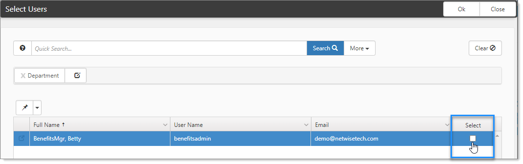 The filtered list is displayed. - Highlight a user, enable the Select option, and click Ok.