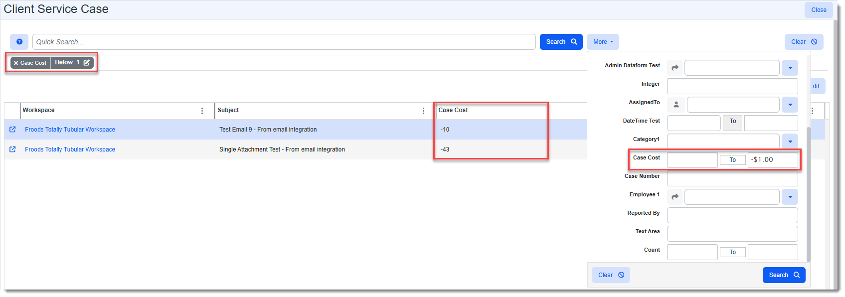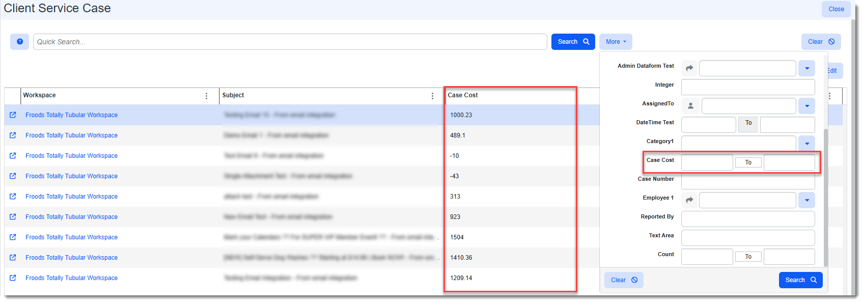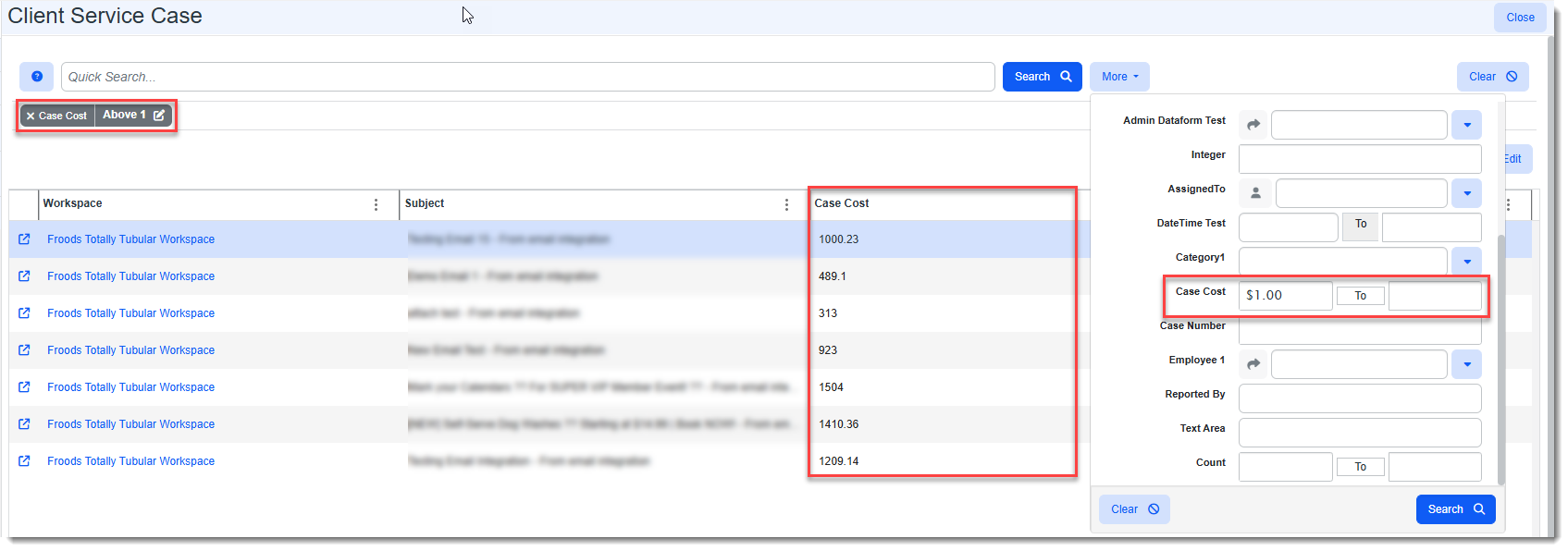 Used to configure a module dashboard "Between" search on numeric datatypes (i.e., Integer, Decimal, Percentage, and Money) within a specified range or reapply the default "Equals" search functionality. When a "Between" search is configured, two fields for entering the search range are added to the More search of the associated module dashboard as shown in the example below of the Client Service Case module dashboard. Case Cost, a user-defined Money datatype field, has been configured as a "Between" search: Note: