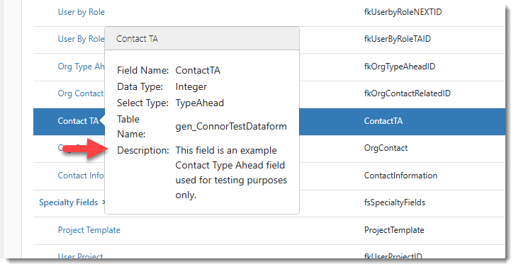 This field has a 1000-character allowance. Note: Once you add Description text, you can view it from the Dataform fields list without needing to open the field properties record when you hover the mouse over the field name: Very long descriptions may be truncated. In those cases, you will need to open the field properties record to view complete details. |