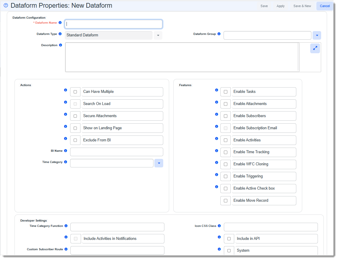 | 1. | On the Dataform Properties form, locate the Features and Developer Settings sections , where you find an array of options. |