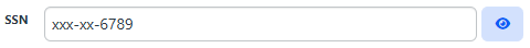 By default, the text is formatted as SSN ### - ## - ####. However, a security mask (xxx-xx-####) is also automatically applied when a user opens a form with an existing SSN or types an SSN into a field. An eye button mask entity is also created for each SSN datatype field: <dataform>.<fieldname>.Mask. This is separate from and in addition to the standard SSN field security entity. Example: gen_Employees.SSN.Mask This entity enables a View/Hide (i.e., eye) button next to the SSN. This serves as a toggle switch to remove the mask for temporary viewing of the complete SSN Example: