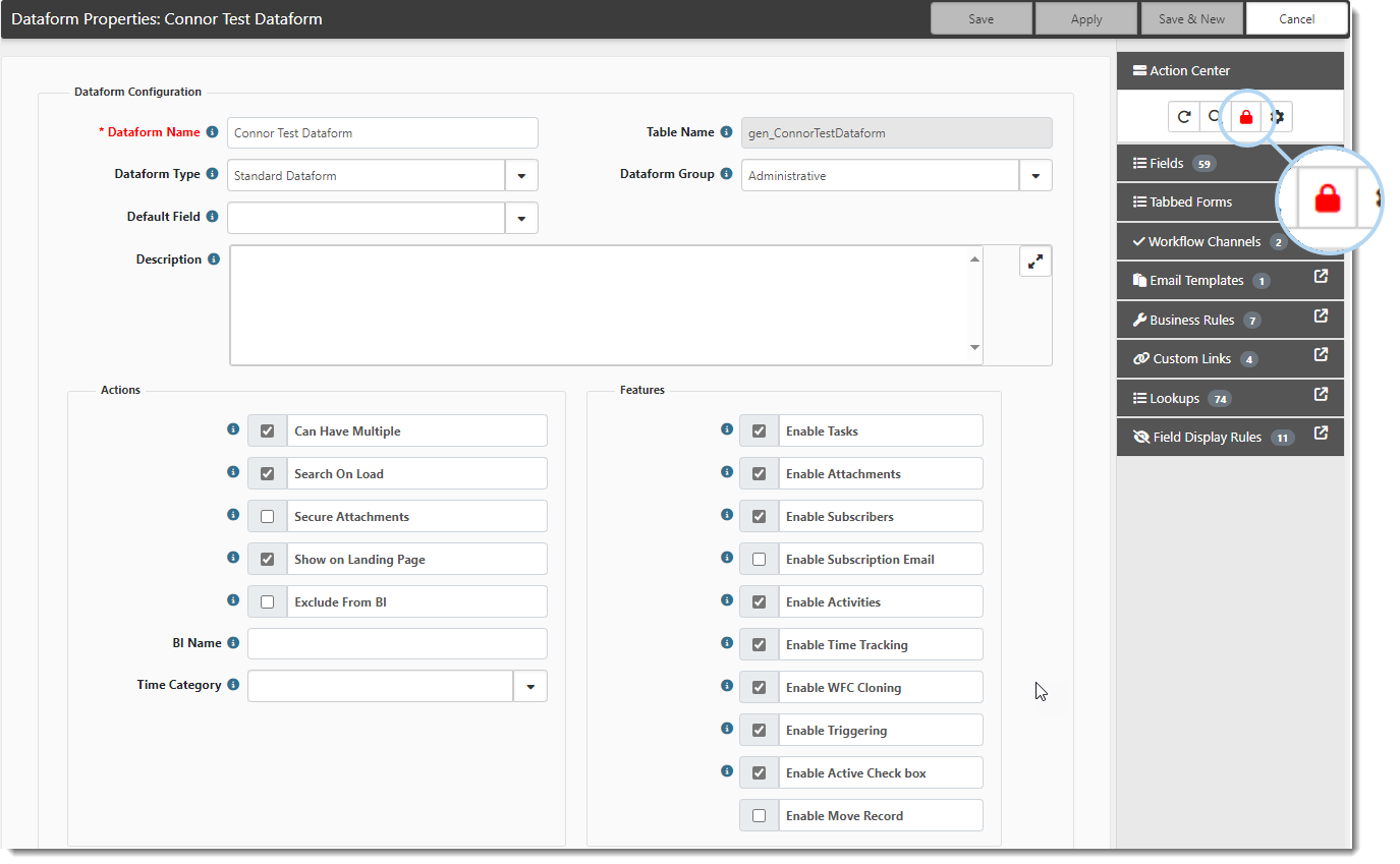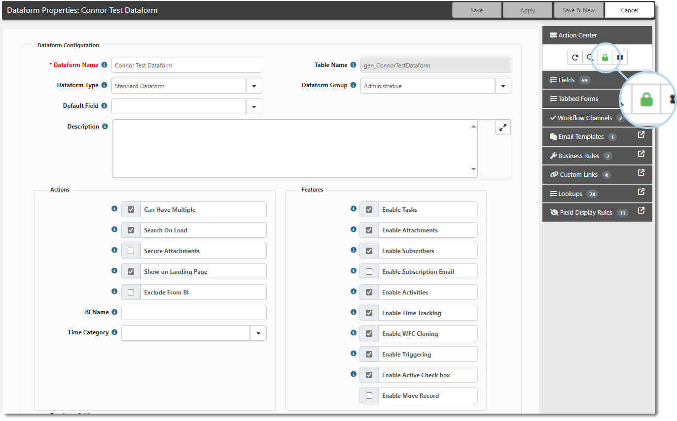 The Dataform Properties form opens. On the Action Center toolbar, a green lock