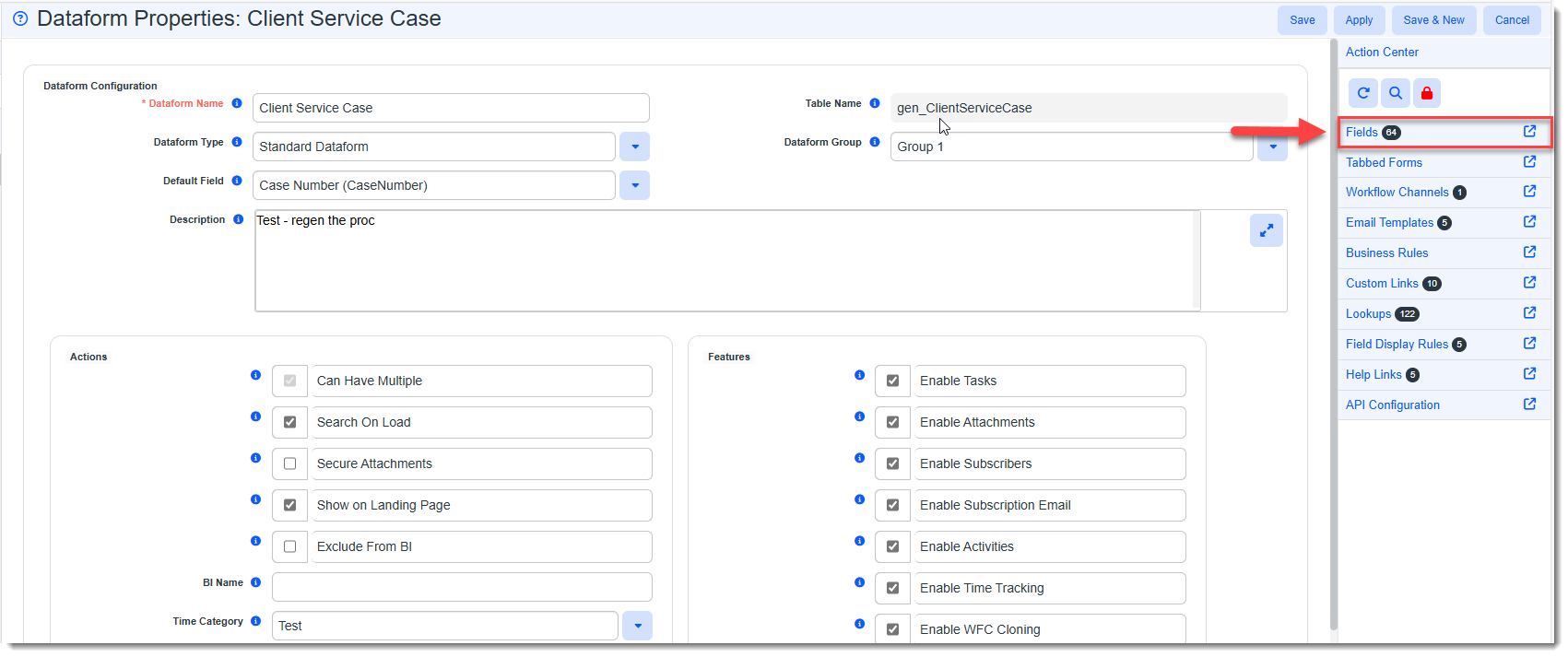 In the Action Center, click Fields.