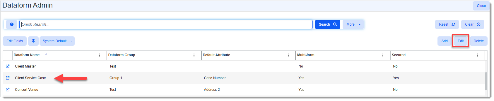 Click the dataform to select it and click Edit.