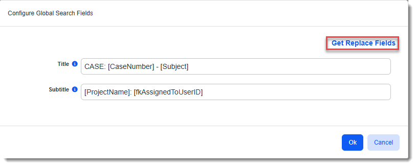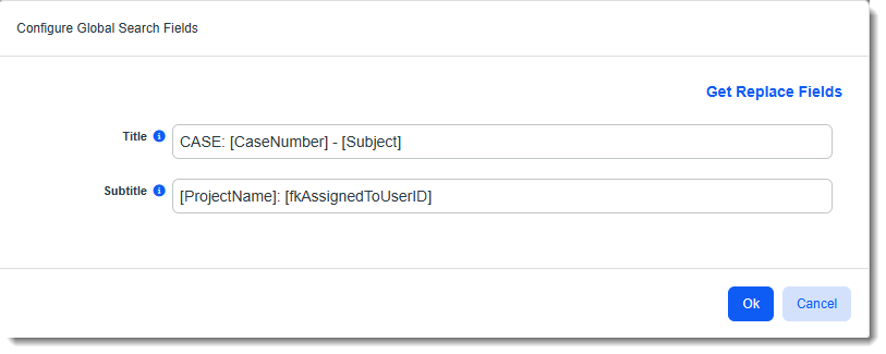 Let's set up the Global Search Results configuration for the Client Service Case dataform. On line 1 (Title) of the search result, we are displaying the Case Number using Replace Field [CaseNumber] and case Subject using Replace Field [Subject]. On line 2 (Subtitle) of the search result we are displaying the Project Name and Case Assigned To using Replace Fields [ProjectName] and [fkAssignedToUserID]: