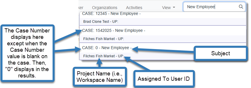 Using the test configuration above, when we perform a Global Search, if a Client Service Case is among the results, the Case Number and Subject values display in the results.