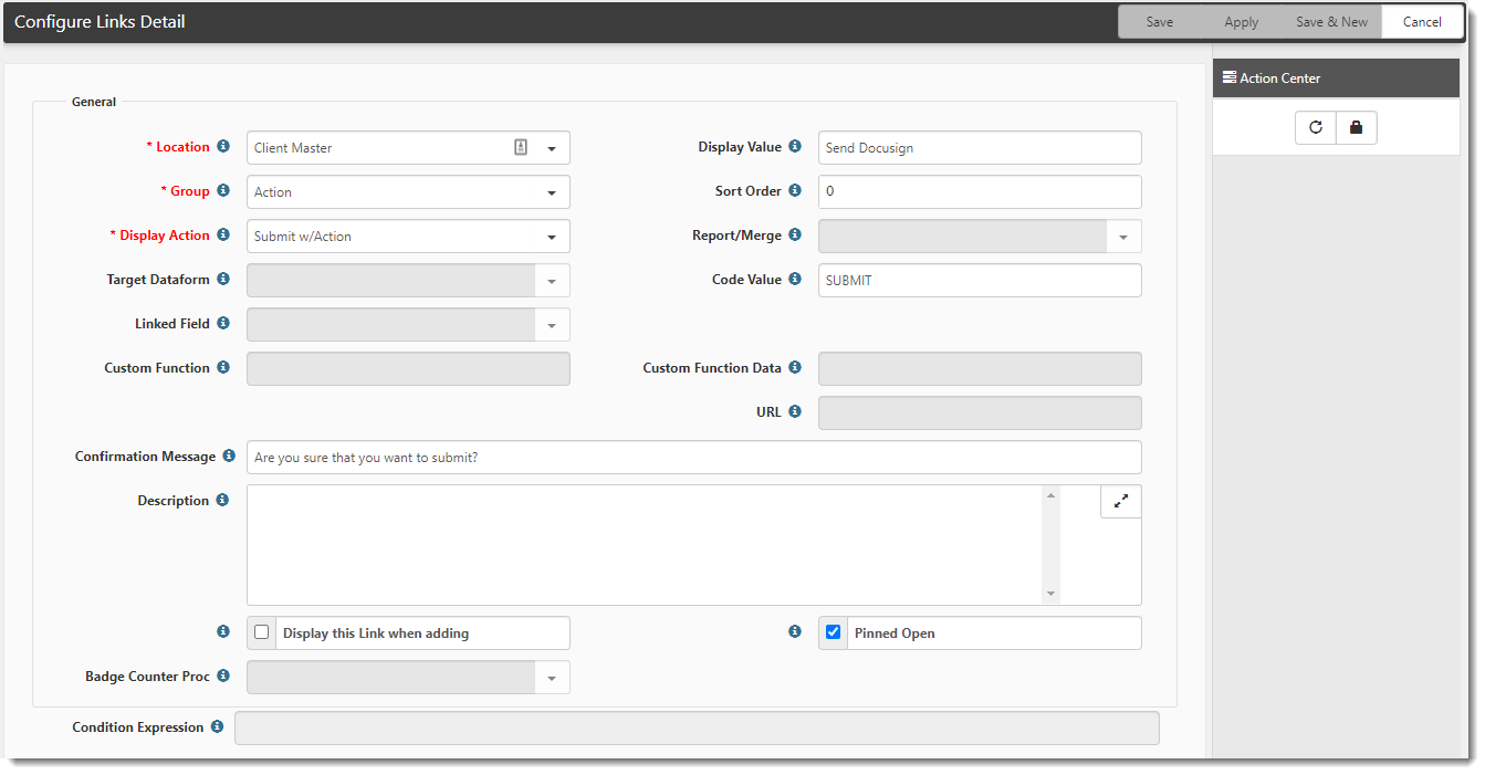 Select Client Master, or other targeted dataform that initiates the submit action to DocuSign. This is the name of the dataform on which you want the link to appear. |