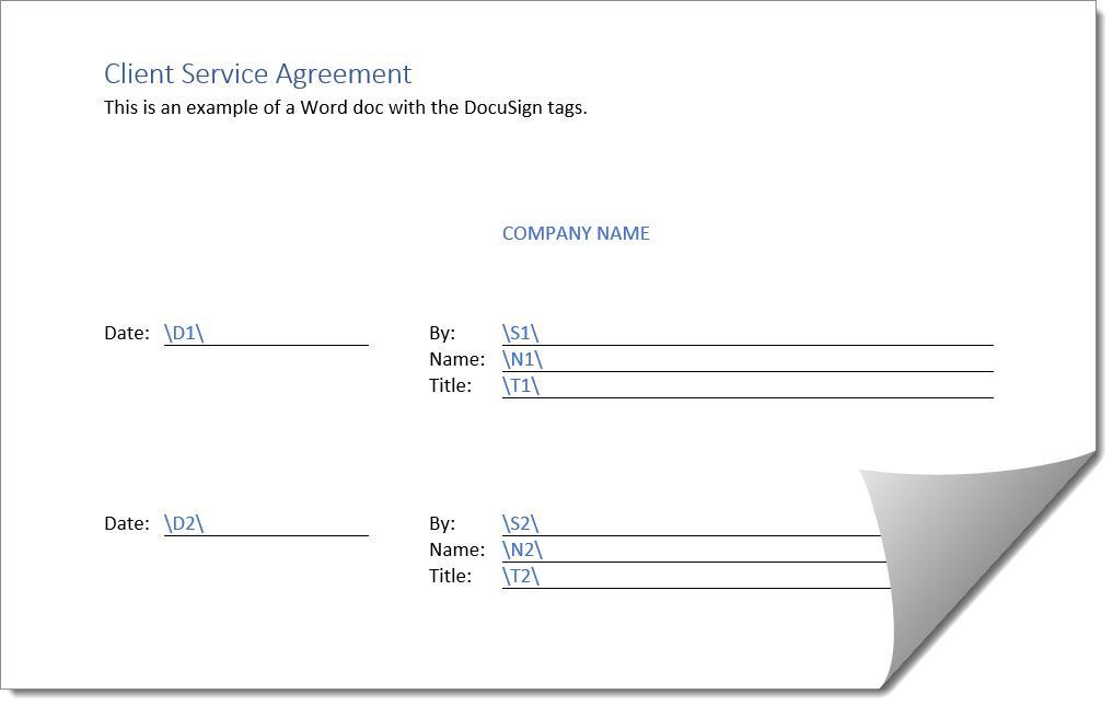 The next step is to configure your document so that you place the tags where the signers input data. The following example illustrates how you would use tags in the input fields for Date, Name, and Signature: