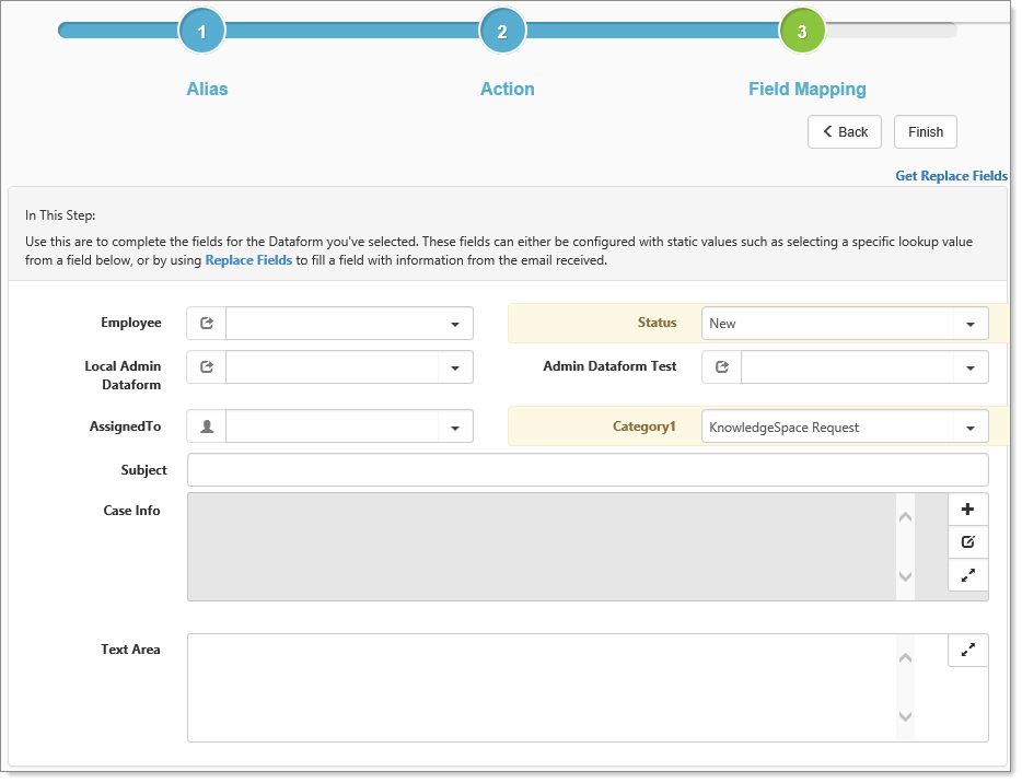 Use field mapping to complete the fields for the Dataform you selected. Fields are exposed to Email Integration by selecting the Cloneable option on field properties under Dataform management. These fields can either be configured with static values, such as selecting a specific lookup value from a field or by using replacement fields to fill a field with information from the received email.