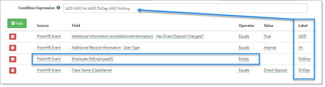 - In Condition Expression, add an AND for the new condition. The following example uses AND NoEmp, where NoEmp is the Label for the condition Field=Employee and Operator=Empty.