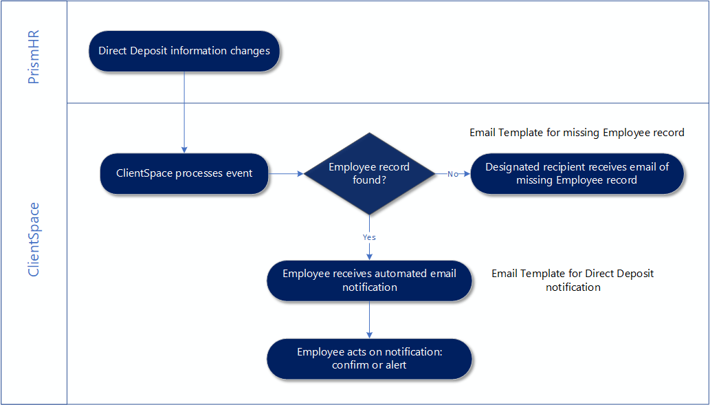 A Direct Deposit notification is driven from a PrismHR Event entering ClientSpace after Direct Deposit information changes in PrismHR. A direct deposit event should always be associated with an Employee. In the event it is not (Import issues, for example), you can configure an Email Template to send a notification to a designated recipient, alerting them that the direct deposit was changed and a notification was not sent to an Employee.