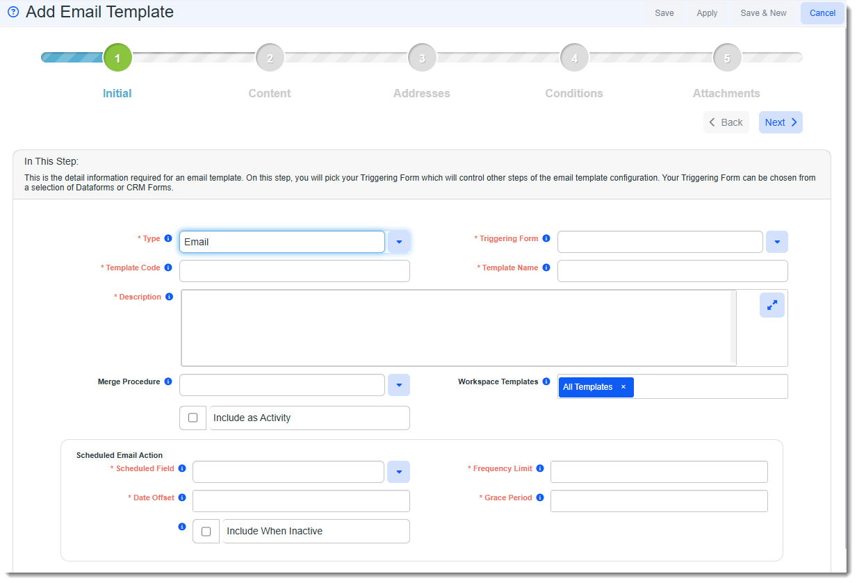 | 3. | When you select Scheduled, the Add Email Template wizard opens with Step 1: Initial. In this step, you configure the date that triggers the scheduled email template. |
