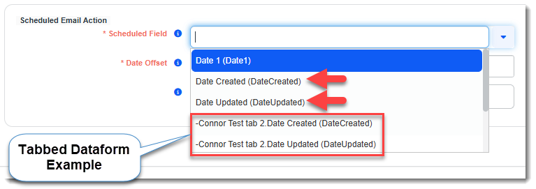 This is the Date or Date/Time field (from the selected Triggering Form) that ClientSpace will check to determine when to trigger the email or survey. In addition to regular form Date fields, you can also trigger your email template by the date a Parent or Tabbed dataform was created (Date Created) or updated (Date Updated). Note: ClientSpace only uses the Date portion of Date/Time fields to determine the trigger date. |