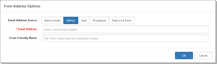 In Step 3 Addresses, you can specify an optional friendly name to display when the From Address uses AdHoc for Email Address Source. This makes it less likely that recipients will view the email as spam. When you select the AdHoc option, specify the Email Address and a From Friendly Name. The friendly name displays in the email along with the actual email address.