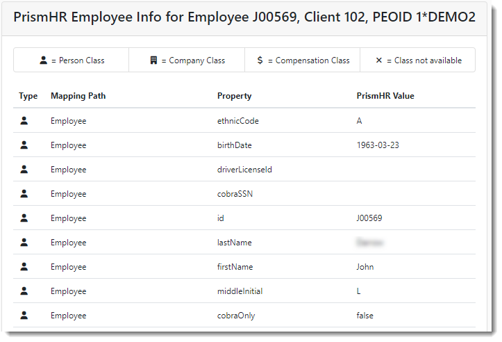 Once the feature is properly configured, when you open an employee record and click the link, real time employee information from PrismHR displays in a new browser tab similar to the following: